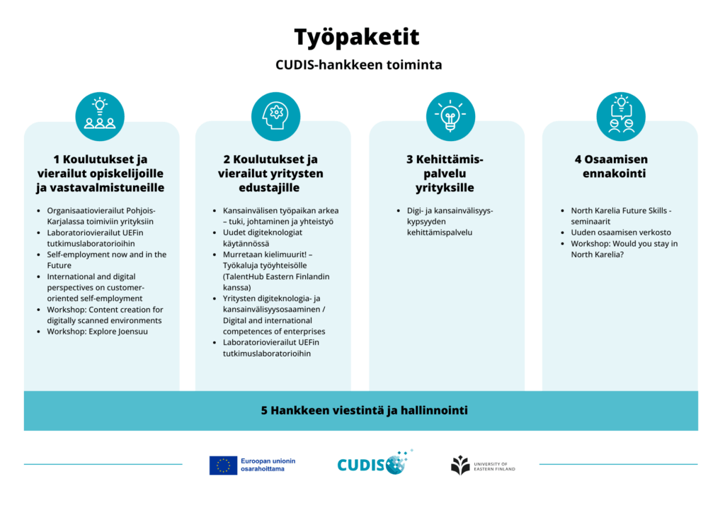 CUDIS-hankkeen tavoite on kehittää työelämätaitoja Itä-Suomessa valmentamalla yrityksiä, työvoimaa ja opiskelijoita. Tulevaisuuden keskeisiä työelämätaitoja ovat monipuolinen kielitaito, ymmärrys kulttuurienvälisestä viestinnästä ja vahva tietotekninen osaaminen. Hanke yhdistää humanististen tieteiden kieli- ja kulttuuriosaamisen sekä tietojenkäsittelytieteiden digitaaliset taidot kokonaisuudeksi, joka vastaa muuttuvan työelämän vaatimuksiin.