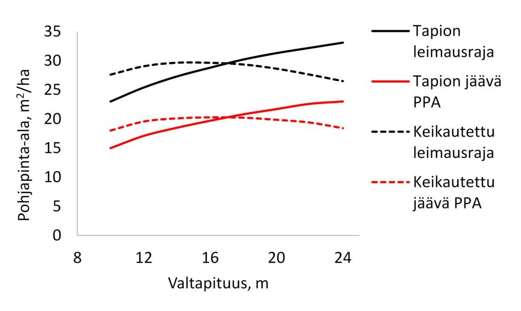 Seuraavaksi keikautin harvennusmalleja niin, että ”leimausraja”, eli pohjapinta-ala, jossa metsä harvennetaan, suureni nuorissa metsissä ja pieneni varttuneissa metsissä. Harvennuksen jälkeistä pohjapinta-alaa keikautin samalla tavalla. Tein keikautuksen siksi, että optimointitutkimukset johtavat päätelmään, että nuoria metsiä pitäisi kasvattaa Tapion ohjeita tiheämpinä ja pohjapinta-alaa tulisi pienentää metsikön varttuessa.