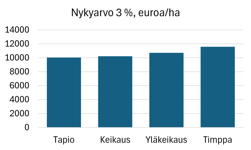 Kolmen prosentin korolla laskettu nykyarvo, kun metsiä käsitellään alaharvennuksilla Tapion suositusten mukaan (Tapio), keikautetaan harvennusmallia (Keikaus), käytetään yläharvennuksia (Yläkeikaus) tai siirrytään vapaan tyylin metsätalouteen (Timppa).