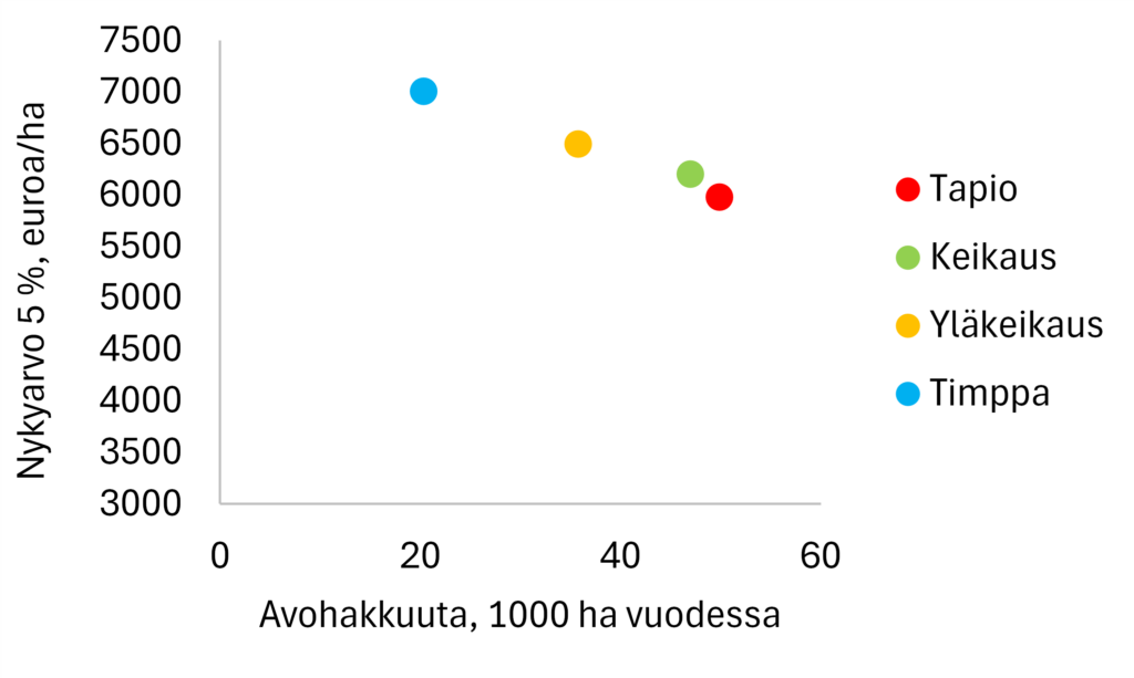 Eteläisen Suomen (5,6 miljoonaa hehtaaria talousmetsää) keskimääräinen vuotuinen avohakkuupinta-ala 50 vuoden laskentajakson aikana ja keskimääräinen hehtaarikohtainen nykyarvo, kun metsiä käsitellään neljän eri ohjeiston mukaan.