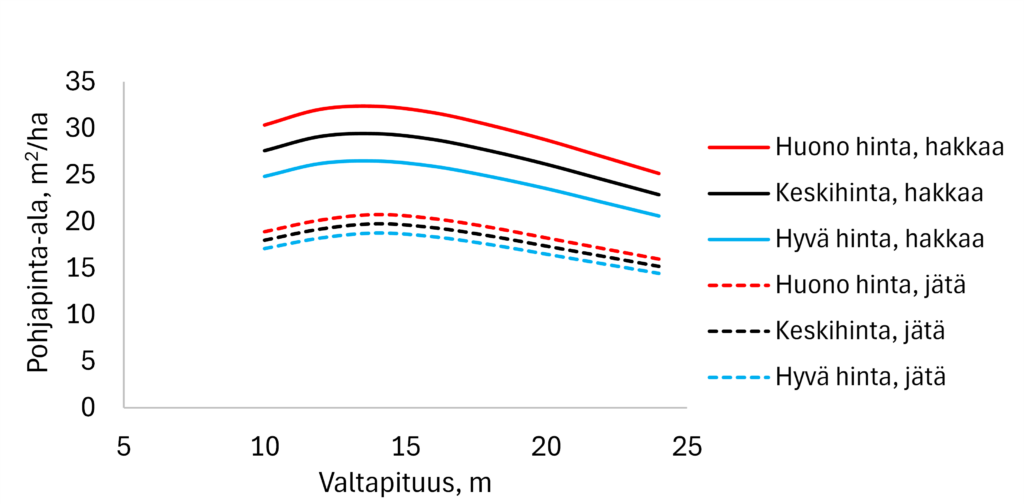 Puun hinnan vaikutus leimausrajaan ja hakkuun jälkeiseen pohjapinta-alaan (periaate, käyrästö ei perustu optimointilaskelmiin).