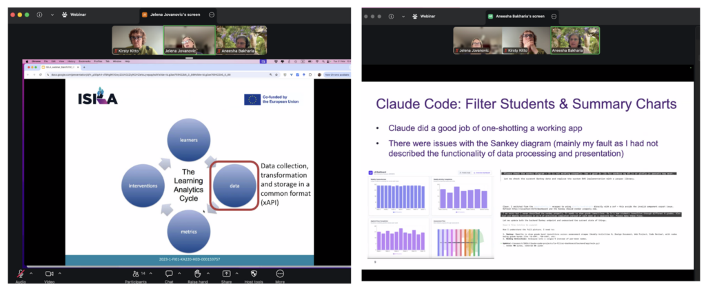The third and the main part of the event was a guest lecture on the use of Generative AI (GenAI) to create learning analytics dashboards, given by Dr Aneesha Bakharia, from University of Queensland, Australia. With her extensive knowledge and experience in using GenAI in learning and teaching contexts, Aneesha was excellently positioned to help us explore how current GenAI-based tools can be used to create flexible and adaptable learning analytics dashboards on the fly. This guest lecture was motivated by the trade-off that we had to make during the project between information richness, on one hand, and timeliness and seamlessness of dashboard creation, on the other. In other words, to make the dashboard creation (relatively) easy for teachers, we had to sacrifice the quality of information that can be communicated via dashboards. The use of GenAI promises both rich and timely feedback and seamless dashboard creation. Aneesha demonstrated how seamlessly custom learning analytics dashboards can be created with the frontier GenAI coding tools (Claude Code and OpenAI codex). She has also explained what the creation process looks like, but also warned about some security and privacy issues that may arise with giving GenAI tools unrestrained access to our file system or other private data storage spaces.