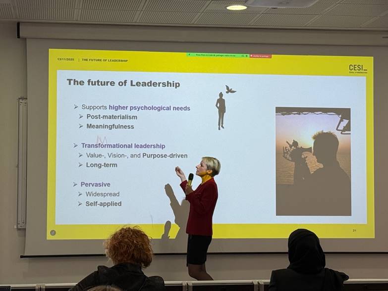 Avauspuheenvuoron jälkeen CESIn tutkimusjohtaja Stephanie Buisine piti keynoten tulevaisuuden johtamisesta. Tutkimukseensa pohjautuneessa esityksessä hän kuvasi, kuinka ihmiskunnan sosiaalinen kehitys on kulkenut käsi kädessä teknologisen kehittymisen kanssa, niin yhteiskunnallisella tasolla kuin organisaatioissakin. Buisinen mukaan perinteinen transaktionaalinen johtaminen – joka perustuu työntekijöiden palkitsemiseen ja rankaisemiseen – ei ole kestävä ratkaisu muuttuneessa työelämässä. Sen sijaan moderniin työelämään ja uusien sukupolvien johtamiseen soveltuu transformationaalinen johtaminen, joka perustuu työntekijän arvojen ja merkityksen ymmärtämiseen ja tukemiseen. Kyseessä on siten kestävä ja työntekijöitä sitouttava johtamistapa. Mutta mitä sitten voidaan odottaa tulevaisuuden johtamiselta? Buisine esittää, että perinteinen malli, jossa yksittäiset henkilöt johtavat organisaatioita jää vähitellen taka-alalle ja tilalle kehittyy organisaatioita, joissa hierarkia on entistä matalampi ja johtajuus jakaantuu kaikkien organisaation jäsenten kesken. Kiinnostava ja ajatuksia herättävä esitys!