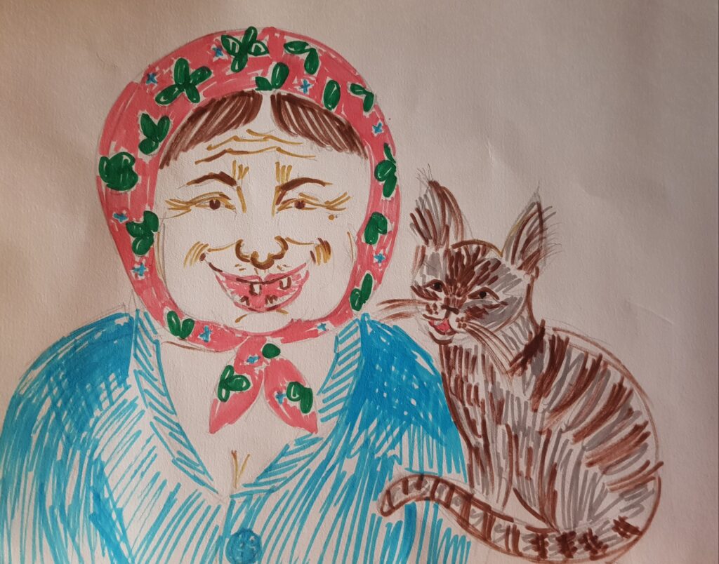 Toinah kaččuo kiirotin ihan pöllästynyön nägözenä, da se lähti tulemah kohti, kaččo milma buitto kuin terstaudunuona da n’augu: “Midäbä killotat?” Sentäh kun olen lapsesta suaten kaččon televiizorua, en ollun ällistyn siidä, jotta kazi pagizi, a sinine turkki milma muga hämmässytti, jotta sanoin suorah: “Kuinba olet tuan värine?” Kazi nagro kuintahto vastakavazin da sano: “Sen taki tahtozit tiediä, ga eibä ni tiän ristikanzoin tarviče aivin kaikkie ellendiä. Ei ni miula maksa kummeksie, mintäh työ ielleh järilleh käyttä tuah taloh da iäreh tullessa kannatta hos midä kummua. Taki kazitgi suahah eliä omua elosta da olla hos mimmozie. Mäne vai omah kodih, da mie mänen, kunne mänen.” Siidä se vain lähti laukan tagaista mečikkyö päin da kadoi tuhjoloih, engö ole sidä enämbi nähnyn.