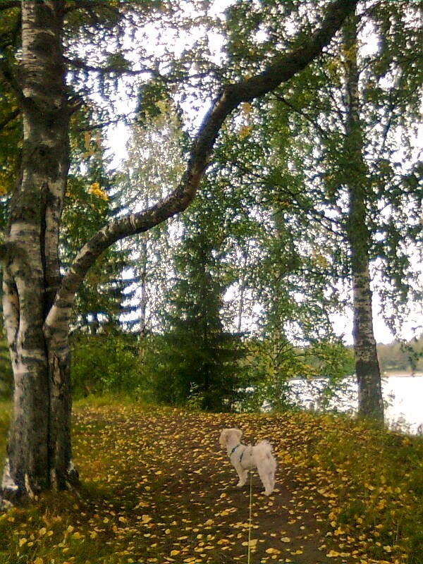 Naine kulgi hil’l’azeh troppua myöte. Hänen rinnal juoksi pieni koiru, kudai azettelih toiči n’uustamah muadu libo mečästämäh tuulen pyöritettylöi lehtii. Mečäs oli hil’l’ažus, kuduadu rikoi vaigu askelien krabineh da tuulen šupahtus puuloin oksis.