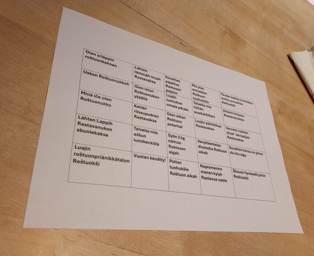 Voit ruveta “kieliruatoloih”! Niitä meilä taričči Timoi Munne, kumpani anto ruavon smiettimäh, kuin vois karjalan kielen käyttyö lisätä omah jokapäiväseh elokšeh. Jakautuma pienempih joukkoloih pakajamah. Erähät ehittih paissa ta yhellä aikua luatie pikkaraisie roštuonaijan lintusie: kaunehet kiät käsimuasteriloilla da heijän opastajal Maria Kuisminal!