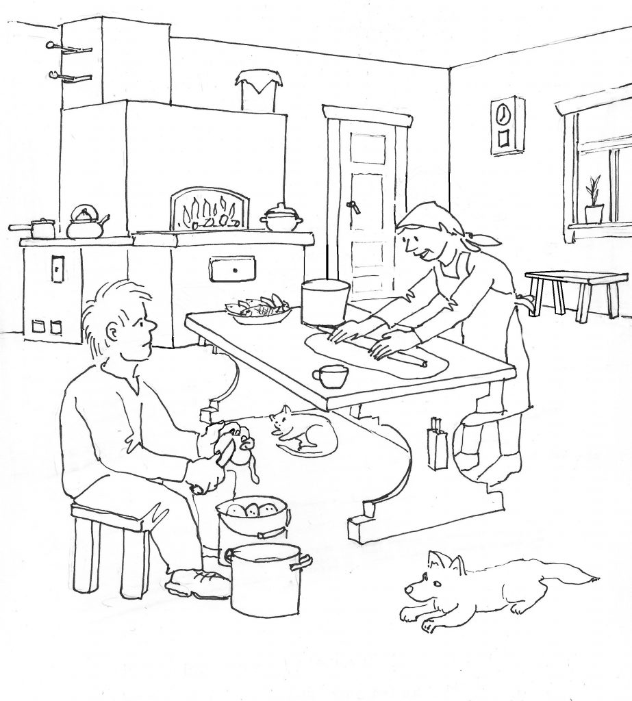 Muamo da tuatto luajitah syömistä. Muamo sriäppiy riissupiirualoi da tuatto kuorittau kartohkua. Hyö paissetah kalat. Kazi da koira levätäh. Päčissä on tuli. Muamo seizou da tuatto istuu. Pertissä on nellä kattilua, stola da stuulat. Muamolla on peretniekka, kengät da takki. Tuatolla on paida, jallačit da houzut. Ikkunalla on kukkapada.