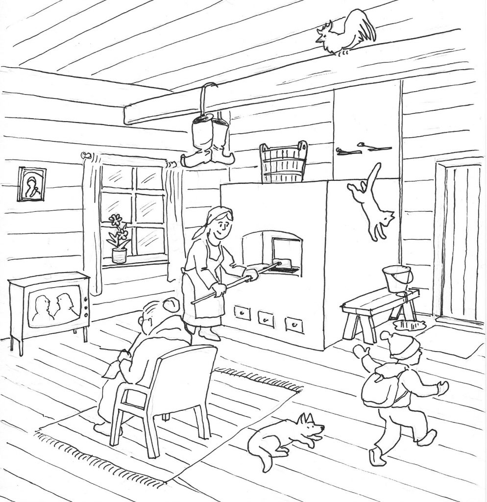 On enzimänargi da pihalla tuulou. Pertissä on ylen lämmin. Kaminassa palau tuli. Muamo da poiga valmissetah syömistä keitändäpertissä. Poiga kuorittau kartohkua, da muamo paistau piirualoi. Stolalla on kalua, sentäh kun hyö ruvetah syömäh mujehta da kartohkua murginaksi. Heijän kazi da koira muatah lattiella. Kazi n’auguu da tahtou syyvä, a koira tahtou eloistua. Stolan piällä on kuppi: siinä on hiilavua čuajuo. On ylen hyvä viettiä tämä kylmä talvipäivä lämbimässä, tunnelmallizessa koissa.