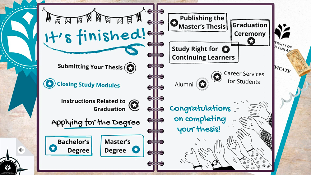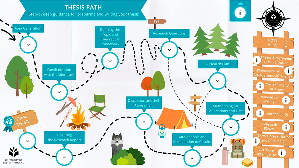 The first version of Tutkielmapolku was built during 2023, after which it has been regularly modified and expanded. In 2025, funding was granted to develop the Thinglink material further. The contents of Tutkielmapolku were updated and expanded to better address current thesis-related questions. Attention was paid, among other things, to the responsible use of artificial intelligence in the thesis process. Also, up-to-date references to the University of Eastern Finland’s guidelines were added to the pathway.
