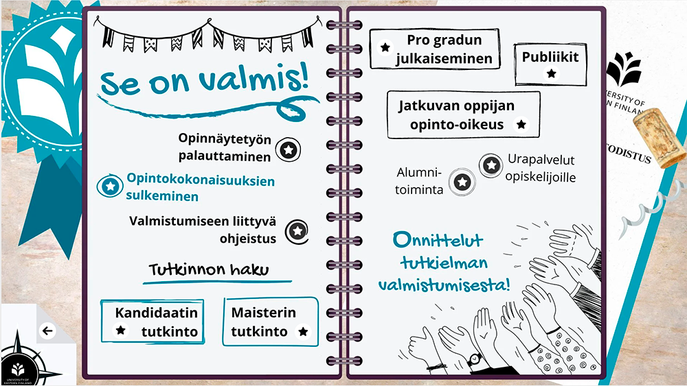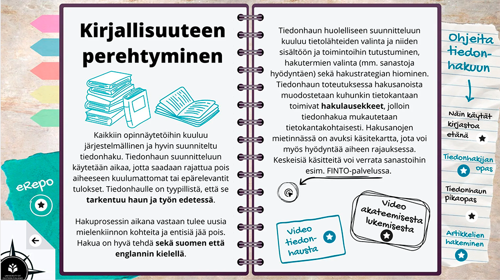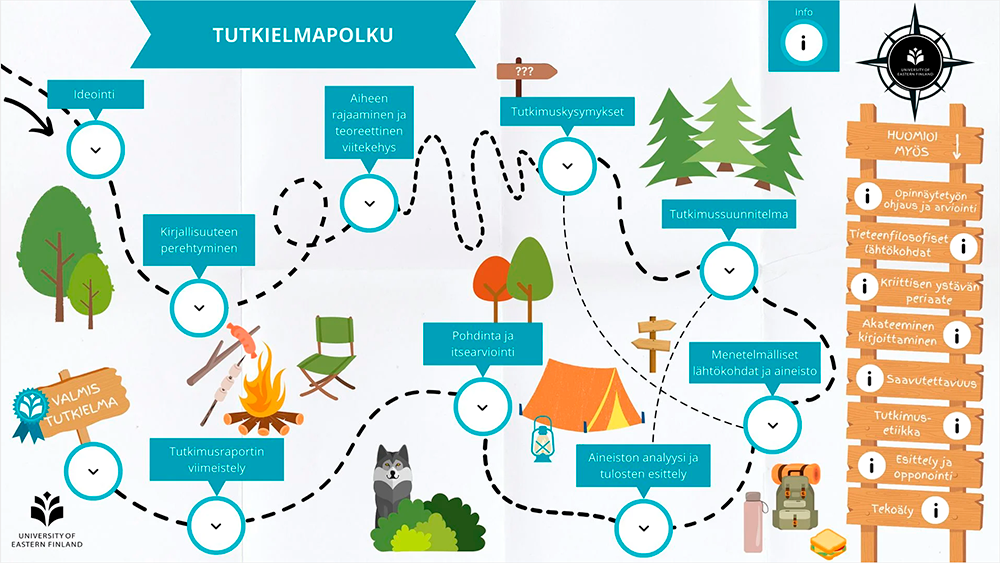 Tutkielmapolku ja Thesis Path, suomen- ja englanninkieliset opinnäytetöiden tukipolut, kokoavat ThingLink-alustalle opinnäytetyön keskeiset vaiheet, ohjeet ja tukimateriaalit visuaalisessa ja helposti hahmotettavassa muodossa. Materiaalien tavoitteena on tukea opiskelijoita opinnäytetyön edistämisessä ja helpottaa opinnäytteiden ohjausprosessia.