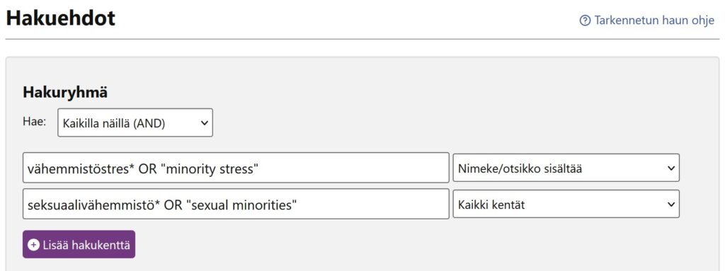4. Kopioi tekemiesi hakujen HAKUHISTORIA esim. snipping toolin tai ruutukaappauksen avulla (kts. 1. esimerkkikuva). Lähes jokaisesta tietokannasta löytyy hakuhistoria – ota huomioon, että usein hakuhistoria tyhjenee, kun selaimen sulkee. Jos hakuhistoria on pitkä, voit ottaa kuvan vain olennaisimmista hauista. Jos et löydä hakuhistoriaa, ota kuva valitsemasi tietokannan tarkennusta hausta, jossa näkyy tekemästi hakulauseke hakusanoineen ja -tekniikoineen sekä löytyneiden tulosten määrä (kts. 2. esimerkkikuva). Kuva tai ruutukaappaus hakuhistoriasta tai tehdystä hausta on pakollinen osa lopputehtävää, ja niitä voi olla useampia. Voit lisäksi kertoa omin sanoin, miten muokkasit hakuja, mikä niistä toimi hyvin, mikä ei toiminut jne. Hauista tulee näkyä, että olet ymmärtänyt tietokannoissa käytettävät hakutekniikat, joita on opeteltu kurssin aikana.